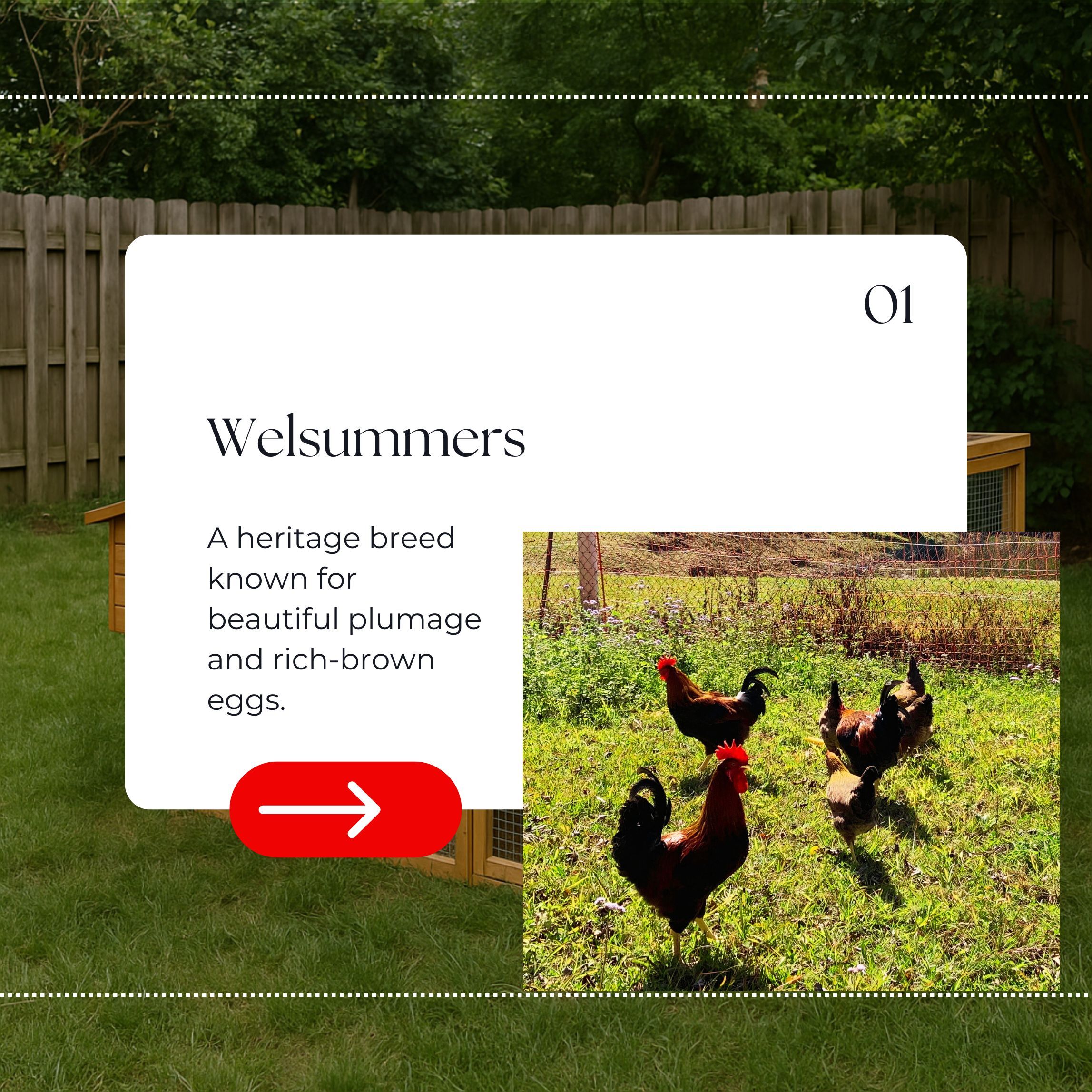 - Welsummers are a heritage breed known for beautiful plumage and rich speckled brown eggs.