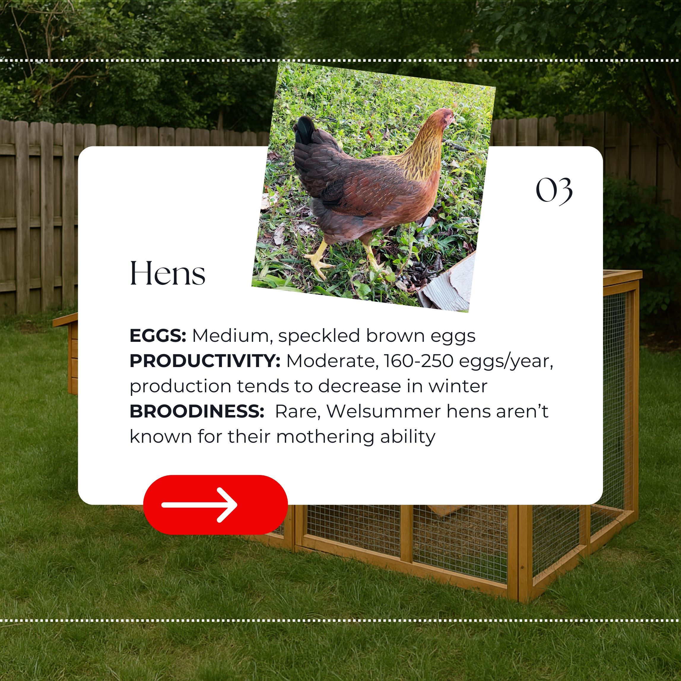 Good nutrition and coop management will ensure that your Welsummers live long, healthy lives and produce plenty of beautiful, nutritious eggs for many years to come!