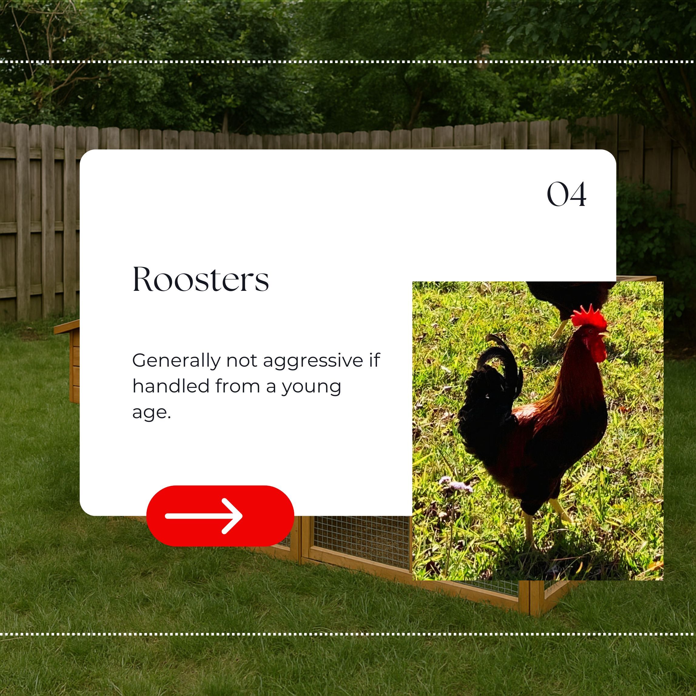 - Roosters are attractive and not usually aggressive if handled from a young age.