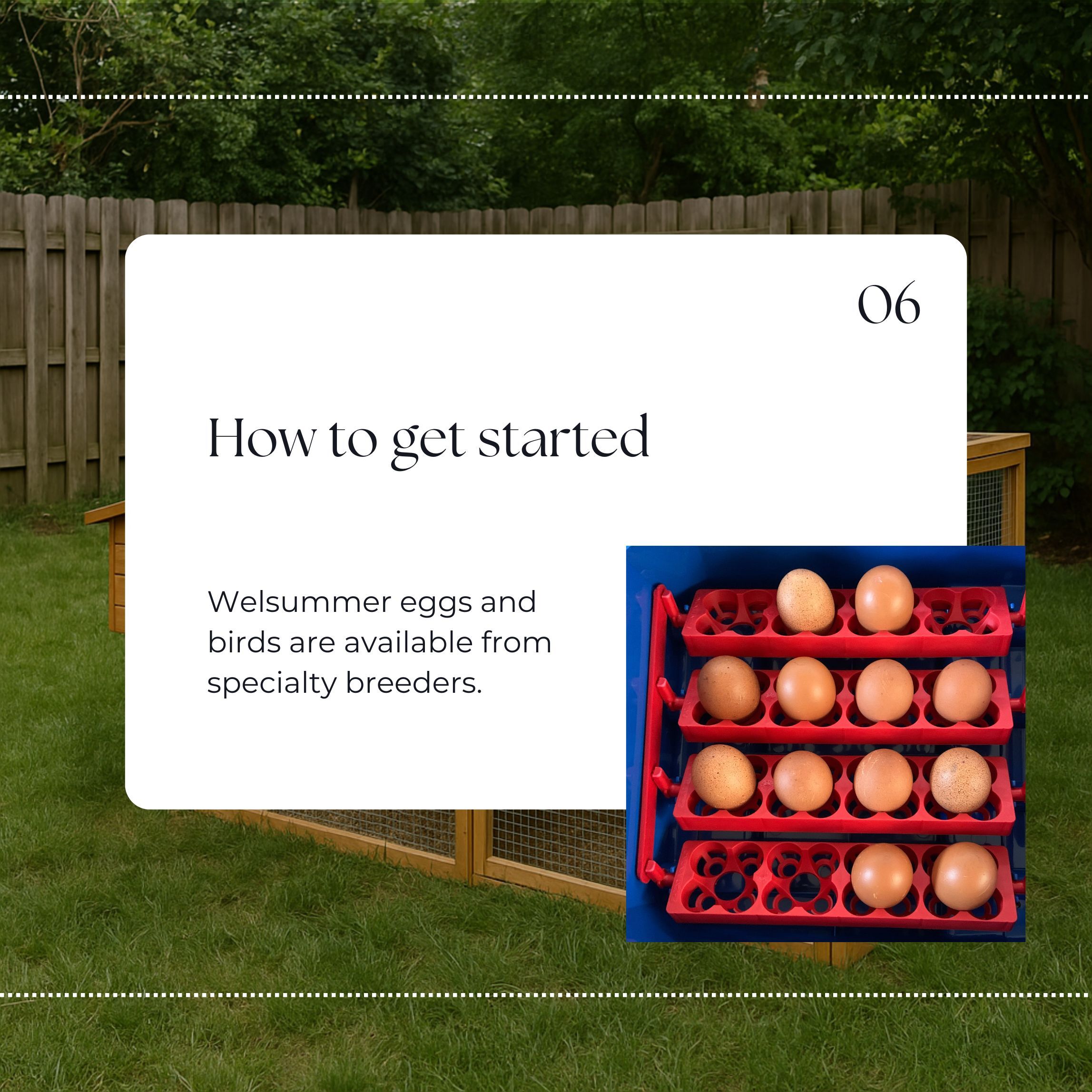 Welsummer eggs, chicks and adult birds can be sourced through some small-scale hatcheries, as well as specialty breeders. The Welsummer Club of Australia is a good starting point for sourcing pure-bred birds from good genetic lines. Look for breeders who focus on maintaining strong genetics and deep, dark brown eggs.