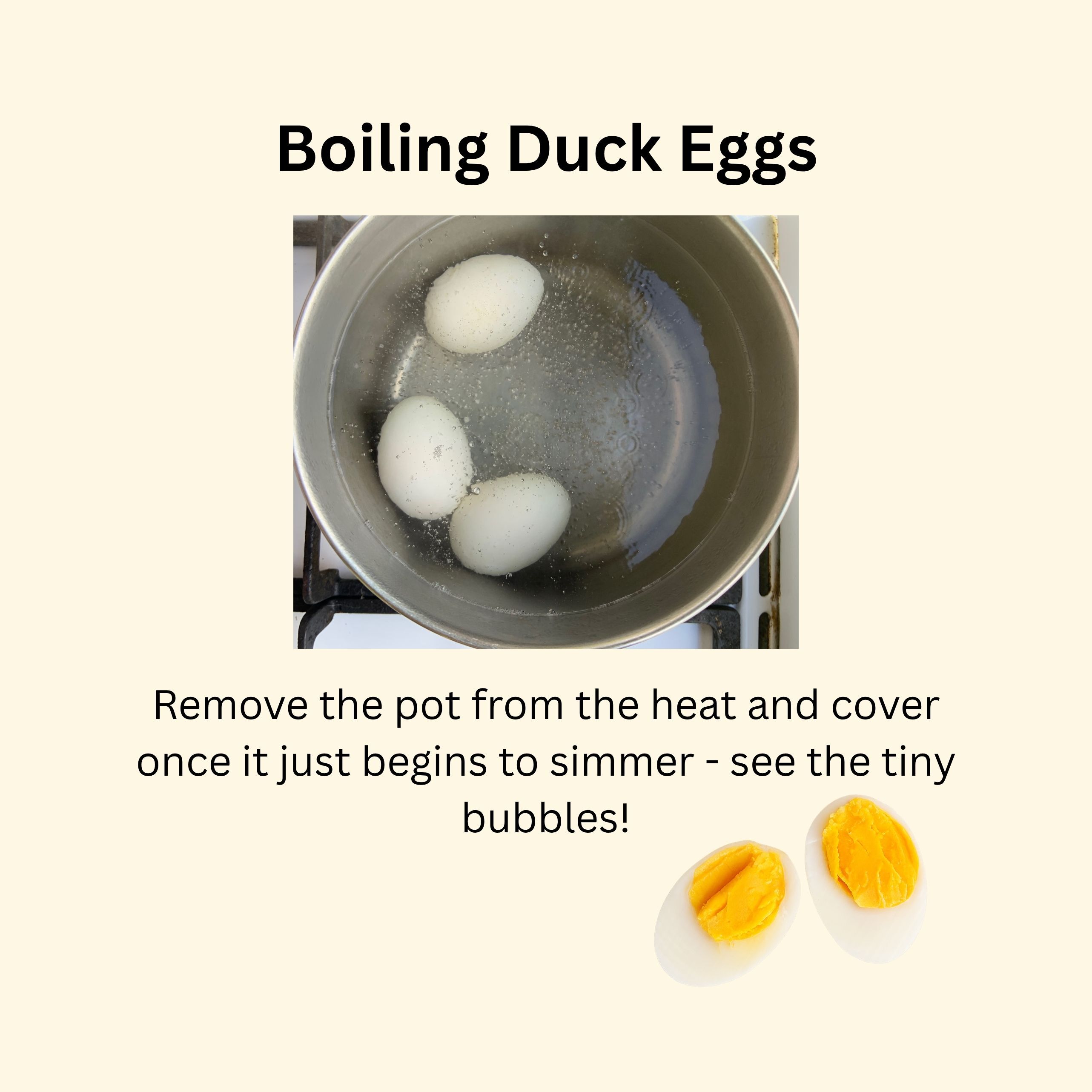 When it comes to peeling, duck eggs can be even more difficult than chicken eggs! Use eggs that are at least 2 weeks old and avoid plunging the eggs into cold water; while this stops the cooking, it makes duck eggs harder to peel. Letting the eggs air-dry until they can be handled and adjusting cooking times as below is the best option for easier peeling.