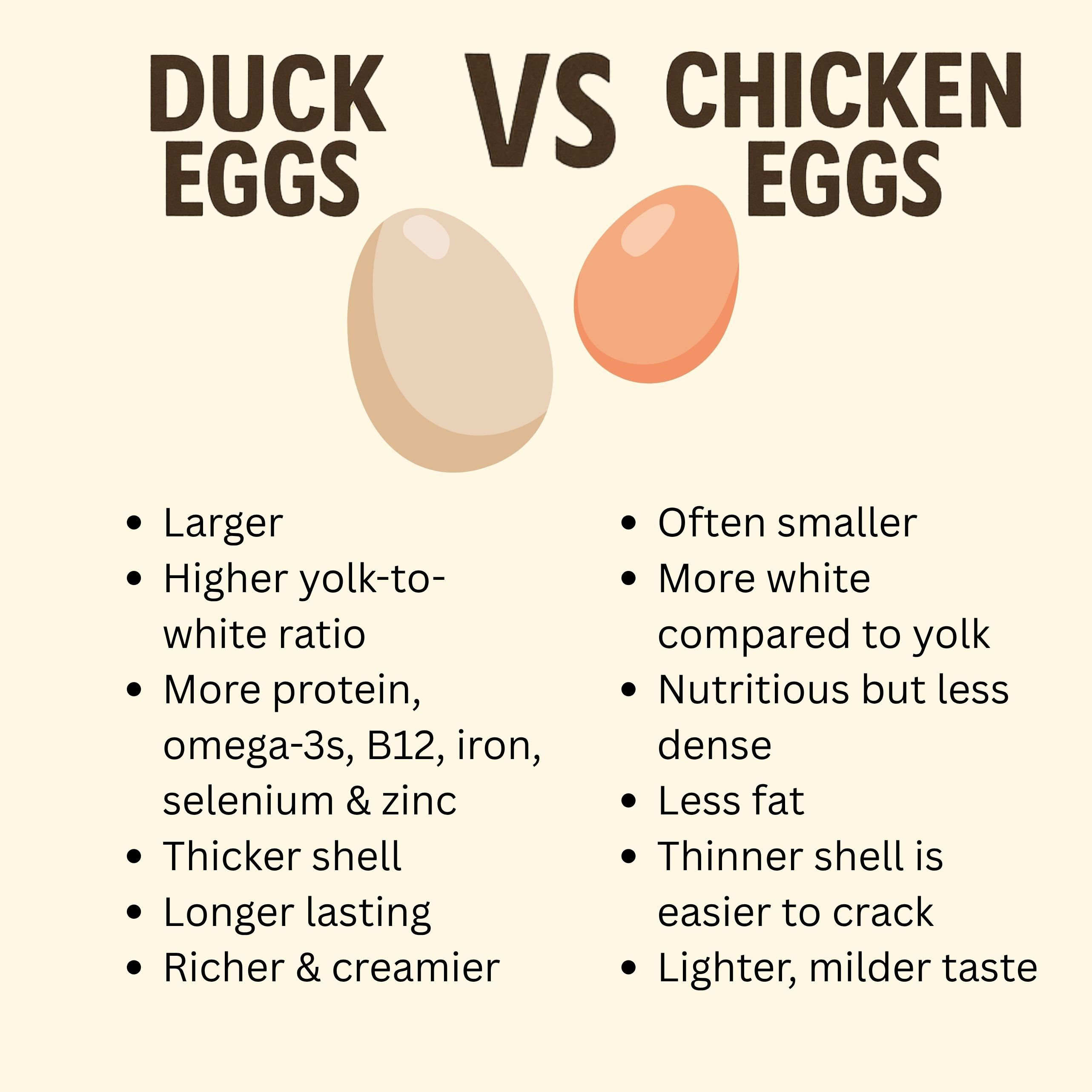 Duck eggs have a much richer, creamier taste than chicken eggs. They have a higher fat and protein content, along with more omega-3 fatty acids, vitamin B12 and minerals such as iron, selenium and zinc.