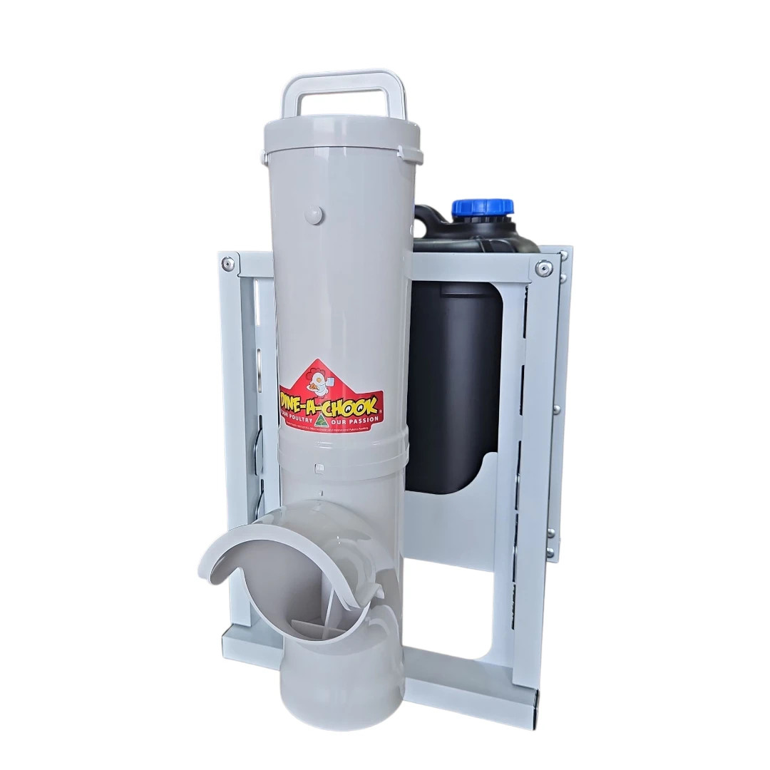 This mount is compatible with the Dine-A-Chook 20L Drum Stand (ACM version only) and the Small Chicken Feeder. It is not suitable for older steel-frame stands or third-party feeders.