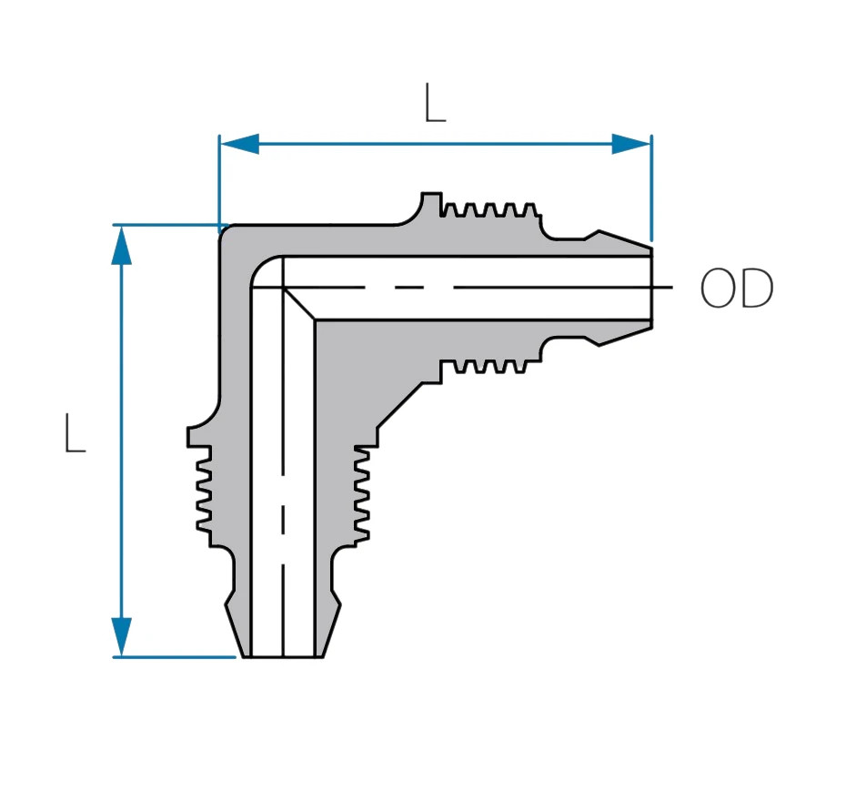 - Secure Tube Join: Connects two 8 mm OD tubes at a 90° angle with leak-resistant barb lock system.